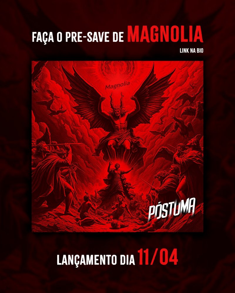 A banda paulista de Melodic Death Metal PÓSTUMA se prepara para lançar seu novo single, “Magnólia”, nesta sexta-feira, 11 de abril de 2025, em um duplo formato: lyric vídeo e áudio digital. O material estará disponível a partir das 09h da manhã no canal oficial do grupo no YouTube e em todas as principais plataformas de streaming e download do mundo.