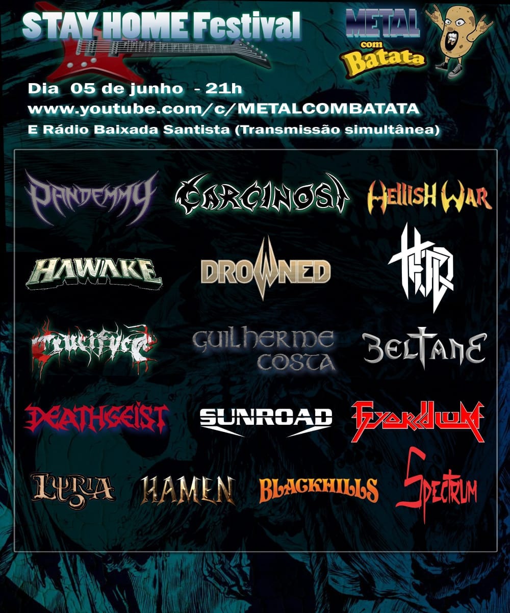 Trata-se do ‘Stay Home Festival’, que está sendo organizando pelo programa Metal com Batata, e irá ao ar pelo YouTube a partir das 21 horas e contará também com bandas como Beltane, Drowned, Hellish War, Deathgeist e muito mais, confira o cartaz: