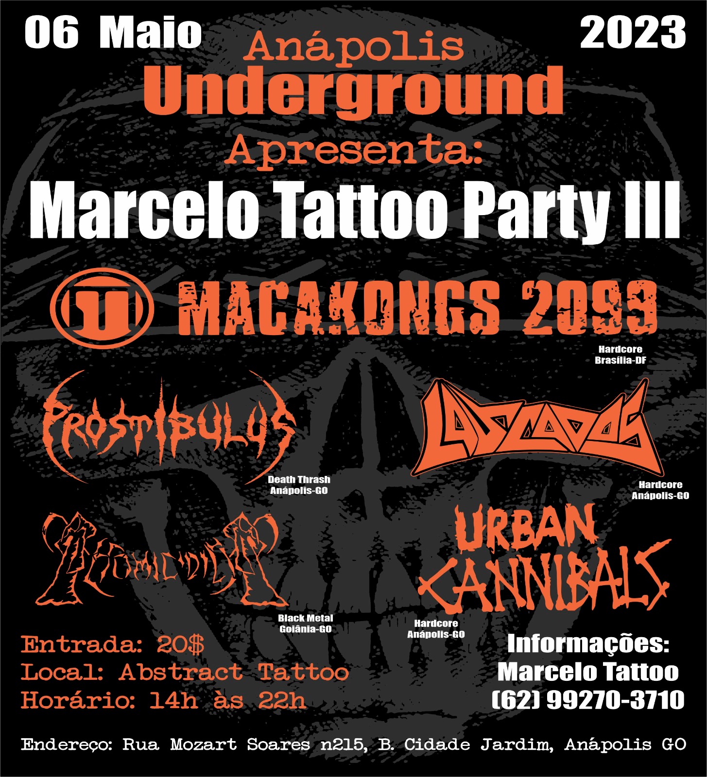 Os goianos do PROSTIBULUS seguem trabalhando pesado na divulgação do atual álbum, “Pesadelo Real”, e estão a todo vapor com sua agenda de shows para 2023. A banda estará ao lado de nomes como Macakongs 2099, Lascados, Urban Cannibals e Homicídio no ‘Marcelo Tattoo Party III’, que acontecerá no próximo dia 06/05/2023 em Anápolis/GO, confira o cartaz com mais informações: