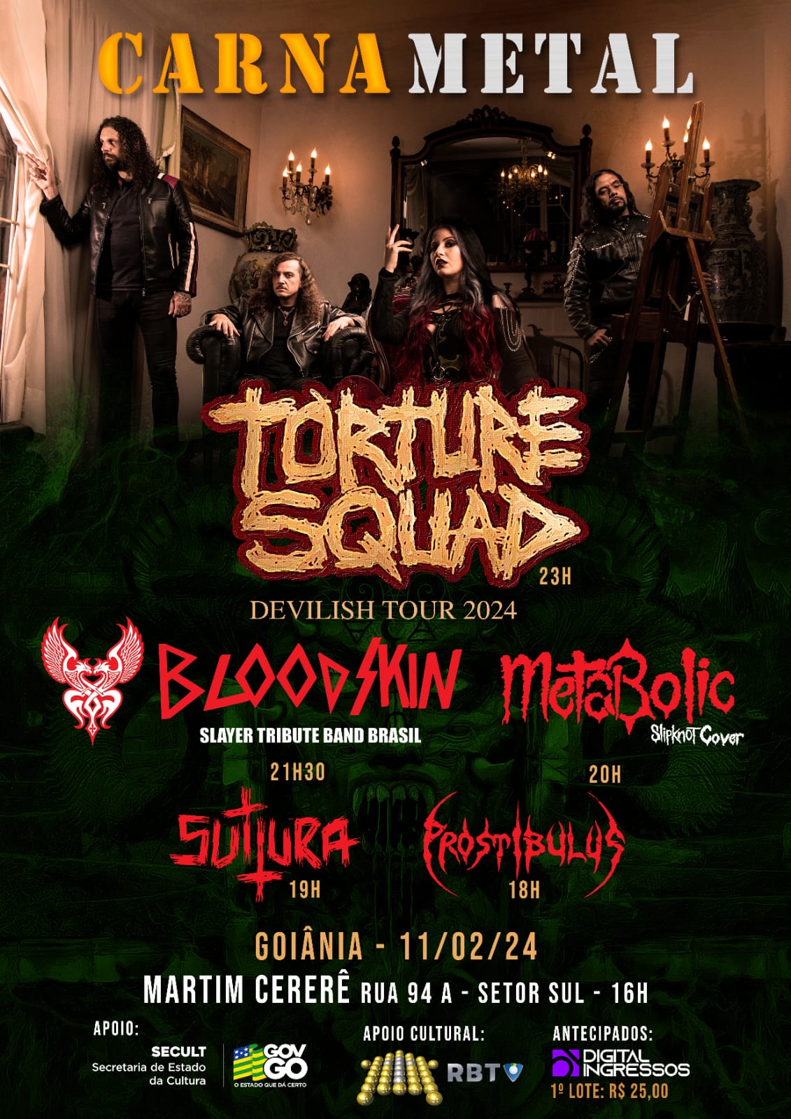 Já o primeiro show de 2024 do PROSTIBULUS acontecerá no dia 11/02 em Goiânia/GO, onde a banda dividirá palco com Torture Squad (que estará passando com sua turnê ‘Devilish Tour 2024’), Bloodskin, Sutura e Metabolic, confira:
