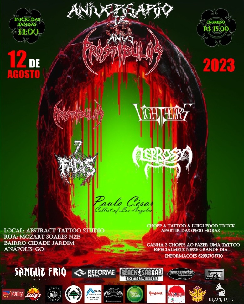 O primeiro deles acontecerá no dia 12/08 (sábado) no Abstract Tattoo Studio em Anápolis/GO, onde se comemorará os 35 anos de carreira da banda ao lado de Leprosy, 7 Facas, Lighthears e Paulo Cesar (violoncelista diretamente de Los Angeles), confira ao cartaz:
