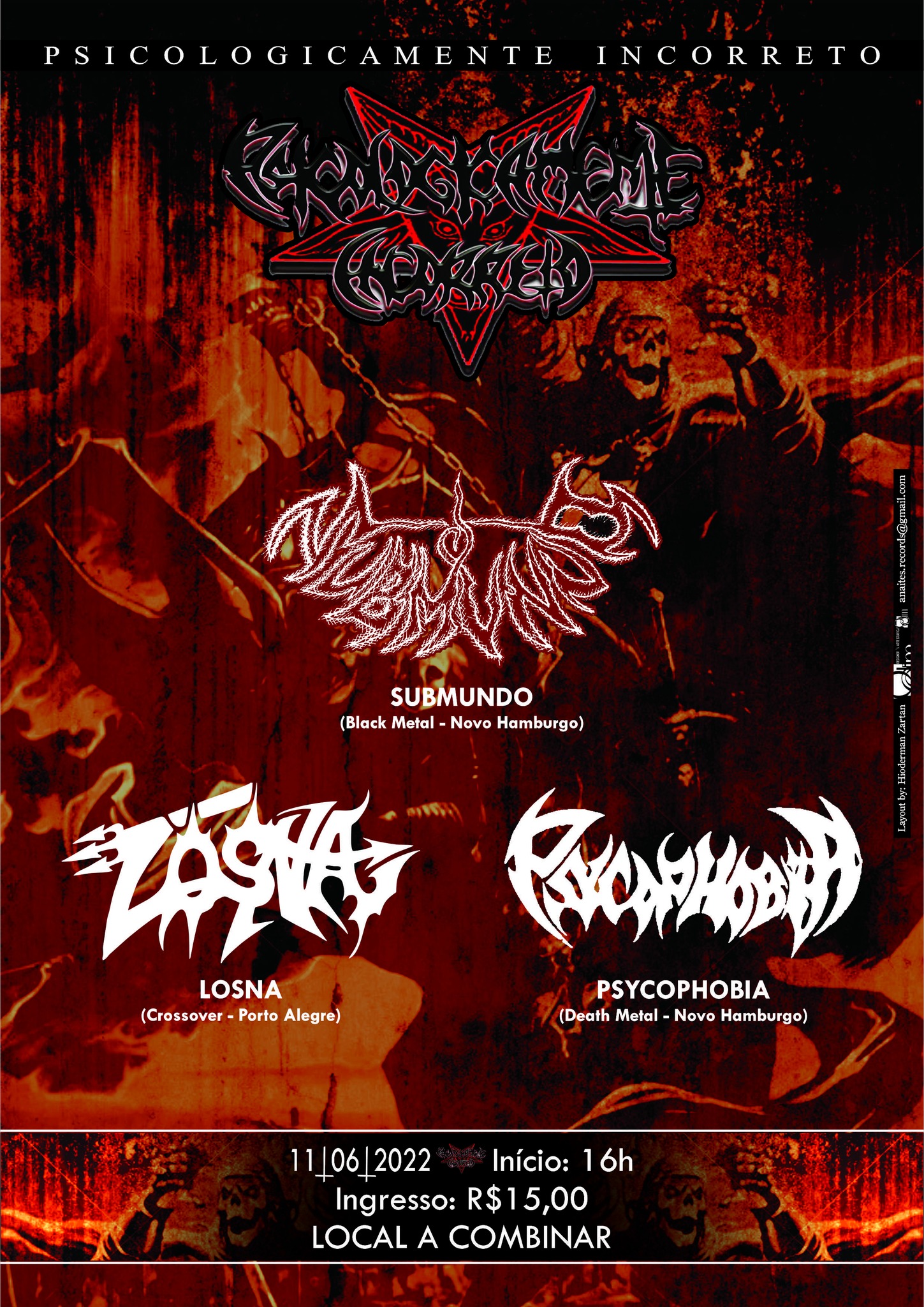 Em outras notícias, o PSYCOPHOBIA já se prepara para duas grandes apresentações nos próximos meses. Trata-se do festival ‘Psicologicamente Incorreto’ que acontecerá em duas datas, sendo primeira no próximo no dia 09/04/2022 ao lado das bandas Atropina e Ravena: