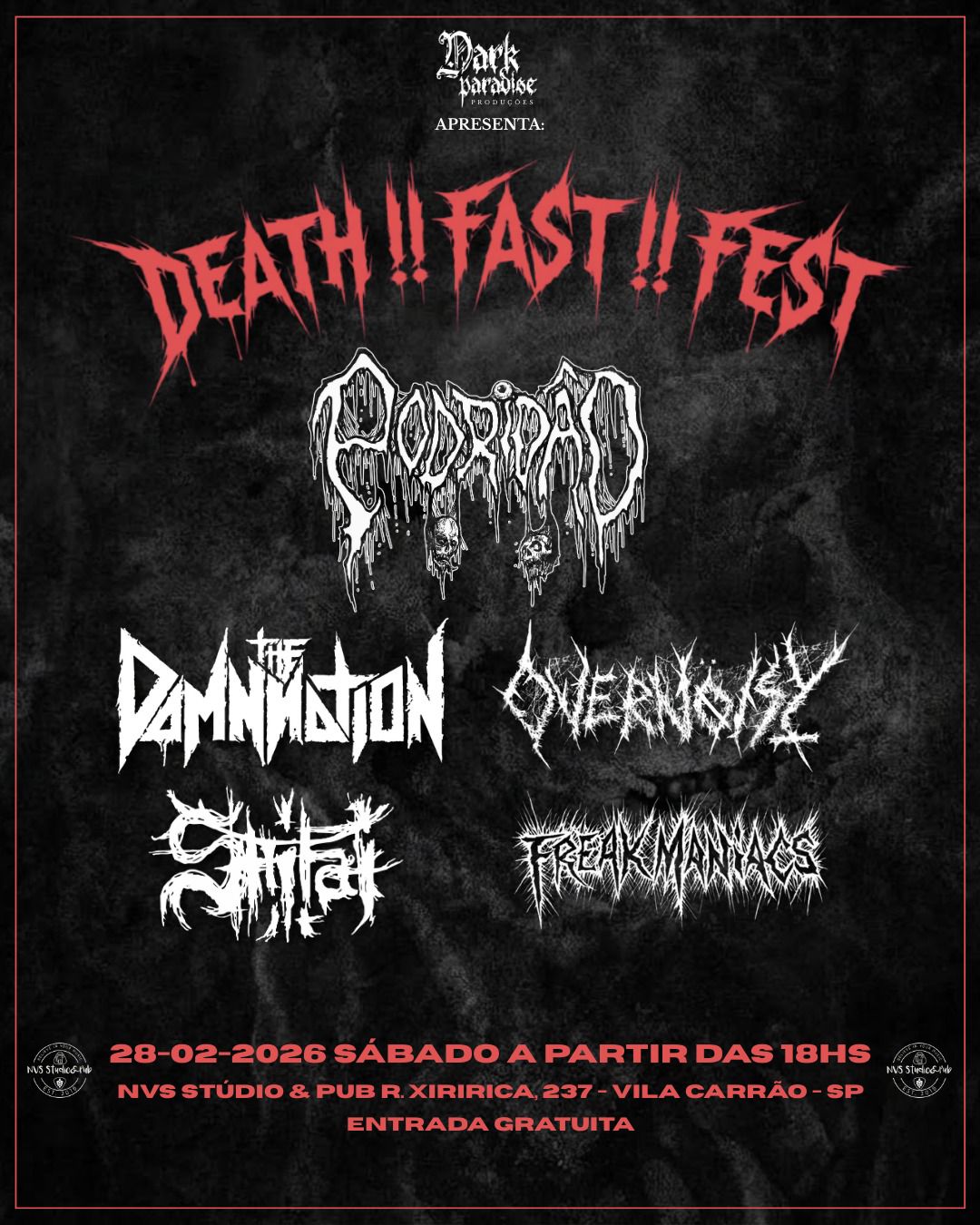 Paralelamente à votação, o SHITAI já confirmou sua presença no primeiro show do ano. O evento ‘Death!! Fast!! Fest’ acontecerá no dia 28 de fevereiro de 2026, no NVS Stúdio & Pub (@nvs_studiopub), em São Paulo. O cast conta ainda com as bandas The Damnation, Overnoisy, Freak Maniacs e Podridão. Confira abaixo o cartaz e o serviço completo para mais informações: