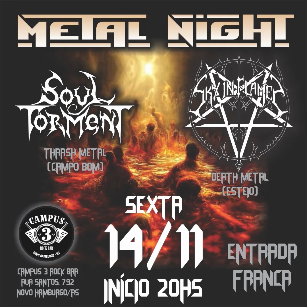 A banda gaúcha de Death Metal SKY IN FLAMES retorna aos palcos de Novo Hamburgo/RS nesta sexta-feira, 14 de novembro de 2025, para mais um show de promoção do seu atual EP, “The Funeral Winds”. O evento, intitulado 'Metal Night', ocorre a partir das 20 horas no Campustres RockBar (@campustres) e contará também com a presença do Soul Torment. Confira abaixo o cartaz e o serviço completo para mais informações: