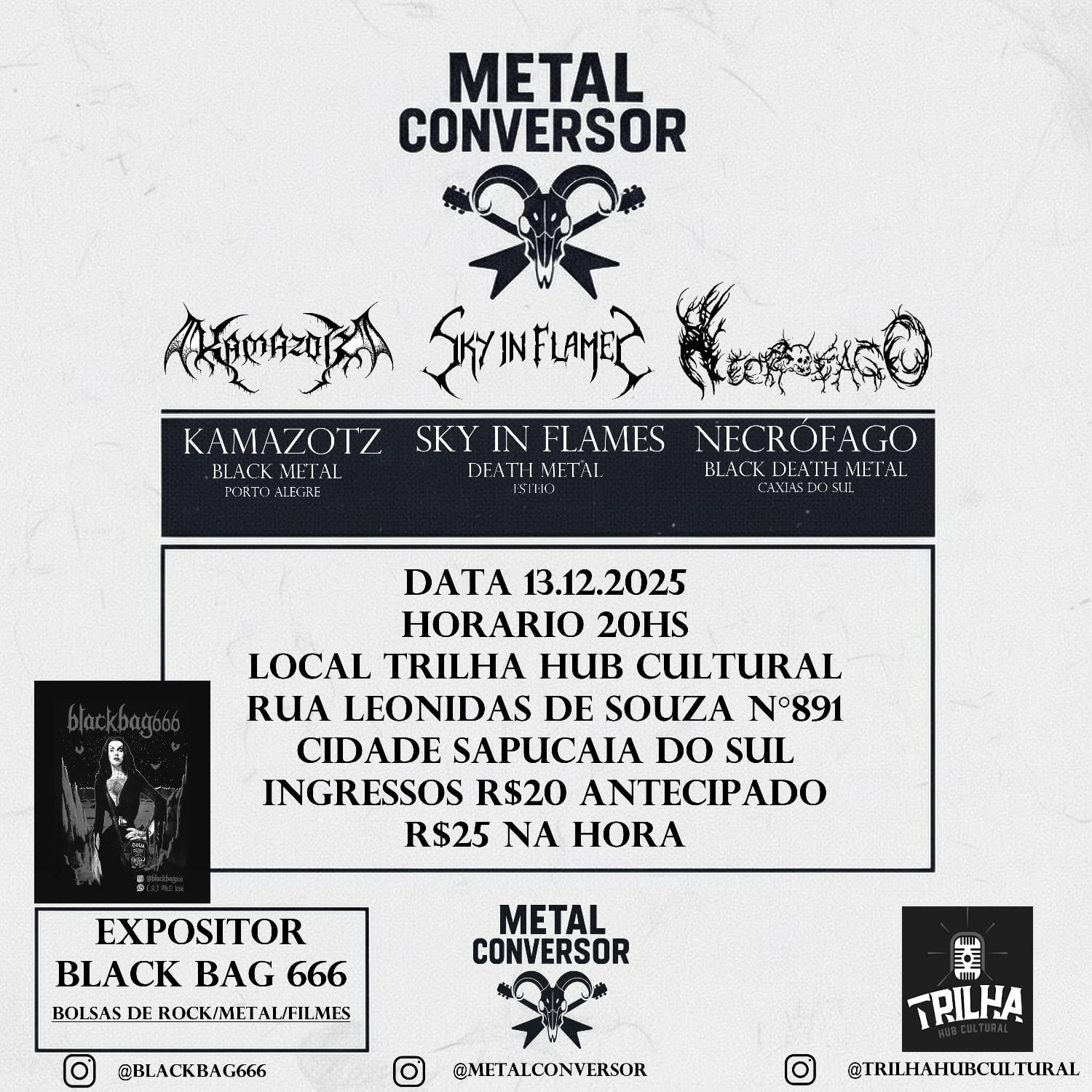 Além do trio, o palco contará com a presença das bandas Kamazotz e Necrófago, fortalecendo o cenário extremo local. O evento também terá um espaço dedicado ao expositor Black Bag 666 (blackbag666). Confira abaixo o cartaz e o serviço completo para mais informações: