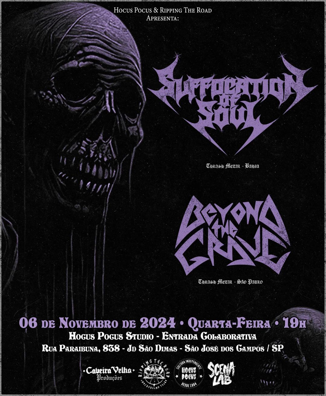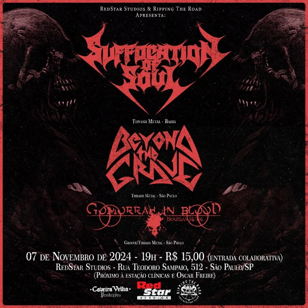 Na quinta-feira (07), o SUFFOCATION OF SOUL se apresenta na capital paulista, onde dividirá o palco do RedStar Studios com Gomorrah in blooD e Beyond The Grave. Veja o cartaz completo: