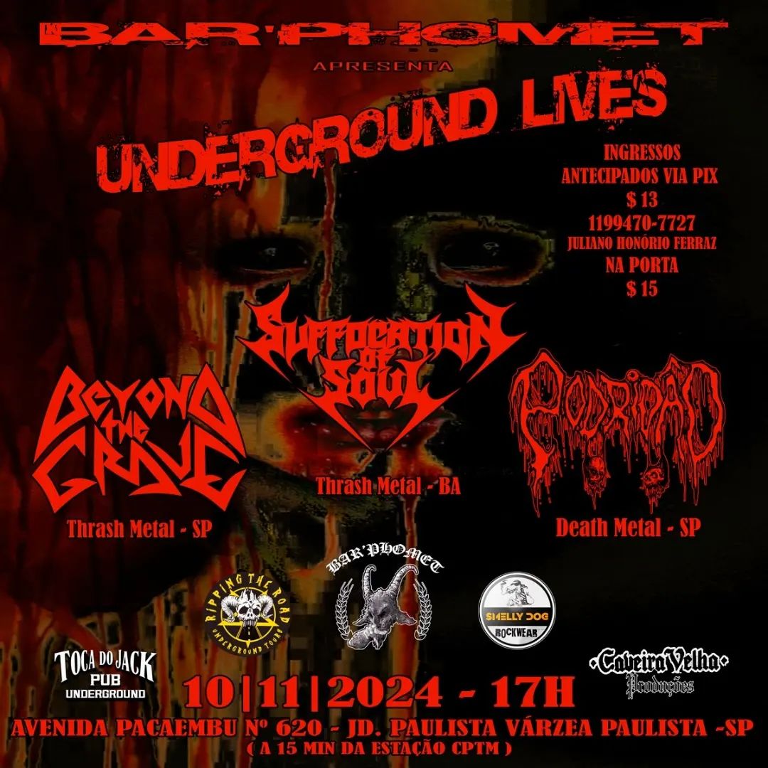A primeira parte desta ‘correria’ finaliza dia 10/11, no Barphomet em Várzea Paulista/SP, local que acontecerá o ‘Underground Lives’, que contará também com Podridão e Beyond The Grave. Cartaz completo abaixo: