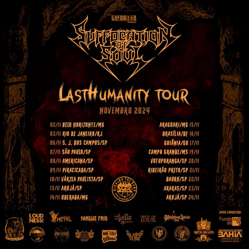 A agenda da banda continua intensa. Três dias depois (13/11), SUFFOCATION OF SOUL viaja para Arujá/SP, onde segue uma sequência de shows diários até o dia 24/11, com a última apresentação também em Arujá. Confira todas as datas da “LastHumanity Tour”: