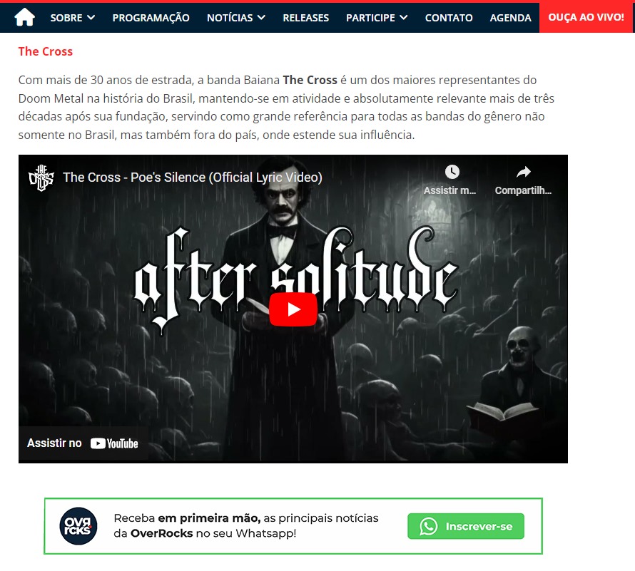 Em paralelo, o THE CROSS segue se destacando de forma significativa na imprensa especializada nacional. Recentemente, em matéria intitulada “Cinco bandas brasileiras incríveis para conhecer o cenário do Doom Metal nacional” do site OverRocks Web Zine, os baianos foram citados como “um dos maiores representantes do estilo na história do Brasil”, além de citar a referência que o THE CROSS é para a cena mundial, onde após suas mais de três décadas de sua fundação e inúmeros clássicos lançados a banda se consolida pela influência que exerce nacional e internacionalmente. Confira a matéria COMPLETA AQUI.