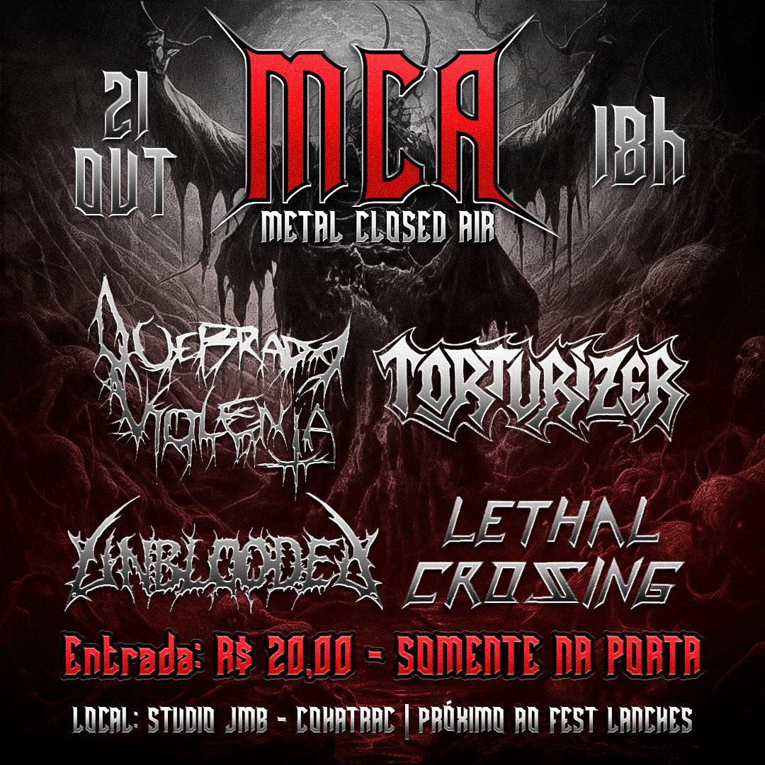 Infelizmente o ‘Maranhão Open Air 2023’ teve de ser cancelado, porém o TORTURIZER não deixará de subir aos palcos para levar seu mais puro Thrash Metal aos headbangers maranhenses neste fim de semana. A banda estará no ‘MCA Metal Closed Air’, que acontecerá no Studio JMB em São Luís/MA neste sábado (21/10/2023), a partir das 18 horas, e contará também com Quebrada Violenta, Lethal Crossing e Unblooded. Confira abaixo o cartaz e serviço completo: