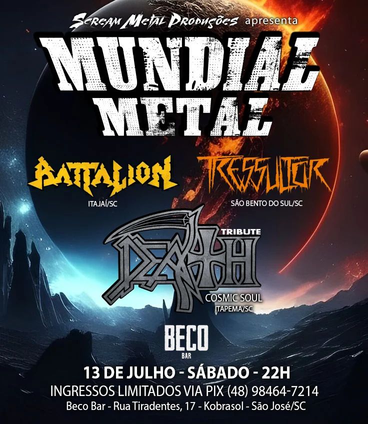 A banda de Progressive/Death Metal TRESSULTOR está em contagem regressiva para mais um importante show de sua agenda deste segundo semestre de 2024. Os catarinenses estarão, no próximo sábado (13/07), ao lado de Battalion e Cosmic Soul no ‘Mundial Metal’, que acontecerá no Beco Bar em São José/SC. Confira abaixo o cartaz e o serviço completo para mais informações: