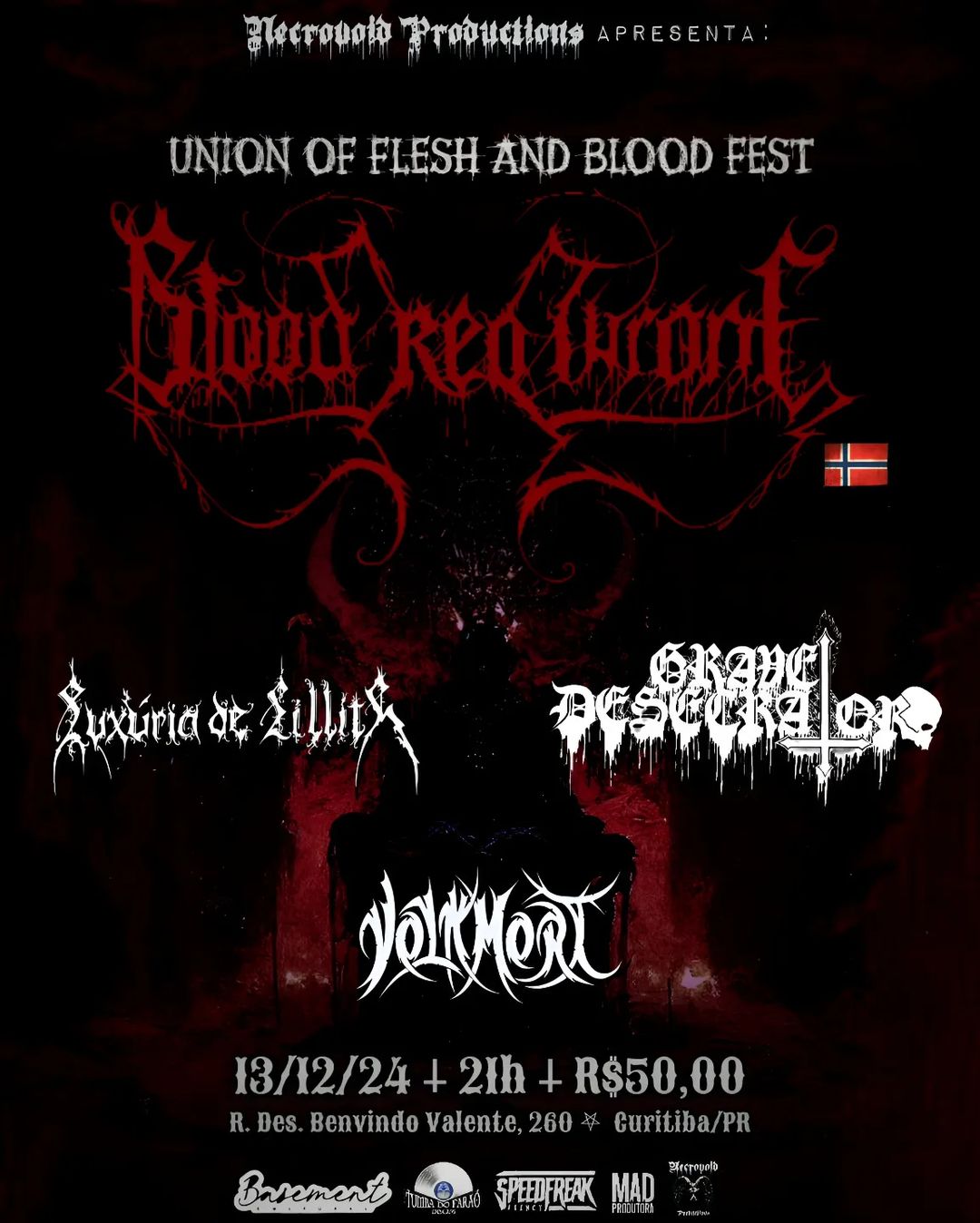 A banda dividirá o palco do Basement Cultural com nada mais, nada menos que Luxúria de Lillith, Grave Desecrator e a lenda norueguesa Blood Red Throne, em um evento programado para iniciar às 21 horas. Confira abaixo o cartaz e todas as informações do evento: