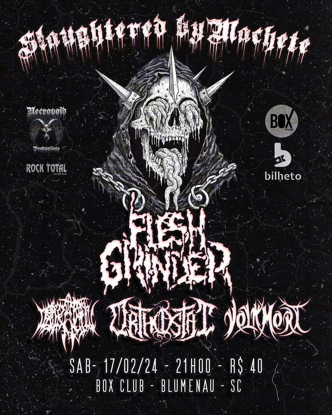 O VOLKMORT segue com sua saga de shows de divulgação do atual álbum “Fallen In The Bloody Field” e já se preparam para subir aos palcos novamente neste fim de semana. A banda estará ao lado de Orthostat (que também promove seu trabalho “The Heat Death”), Flesh Grinder e Desperate Soul no ‘Slaughtered By Machete’ em Blumenau/SC, evento que acontece no dia 17/02/2024 (sábado) no Box Club. Confira abaixo o cartaz e serviço completo para mais informações: