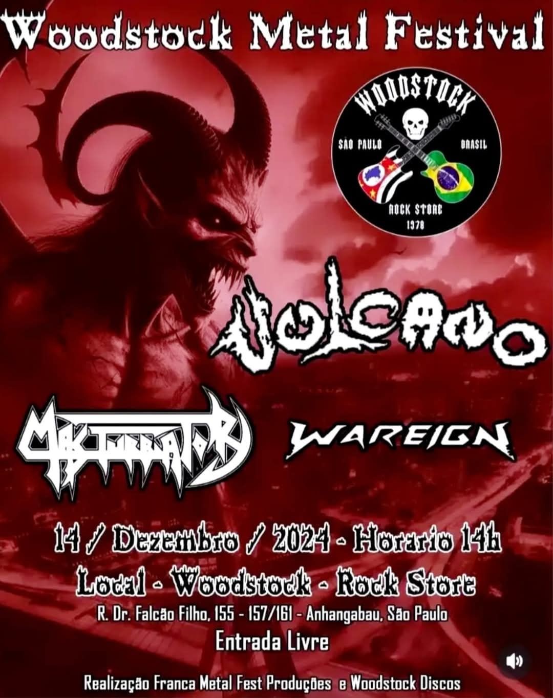 Contagem regressiva para o lendário VULCANO levar a energia do seu novo álbum, “Epilogue”, até a icônica loja Woodstock Rock Store, na capital paulista! A banda se apresentará neste sábado (14/12), às 14 horas, ao lado de Masturbator e Wareign, no ‘Woodstock Metal Festival’, celebrando seu último show de 2024 e fechando o ano com chave de ouro. Confira abaixo o cartaz e o serviço completo para mais informações: