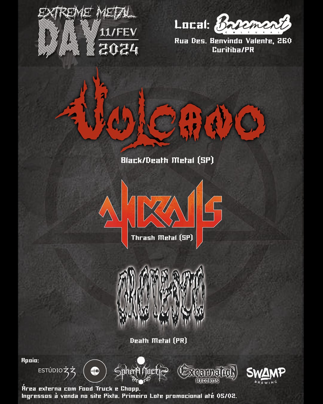A lenda do Metal Extremo VULCANO já se encontra em contagem regressiva para subir aos palcos pela primeira vez em 2024! A banda desembarca em Curitiba/PR, no próximo dia 11/02, para se apresentar ao lado de Andralls e Grotesco no ‘Extreme Metal Day’, que acontecerá no Basement Cultural, prometendo um repertório mais que especial, não dá pra perder! Confira abaixo o cartaz e serviço completo para mais informações: